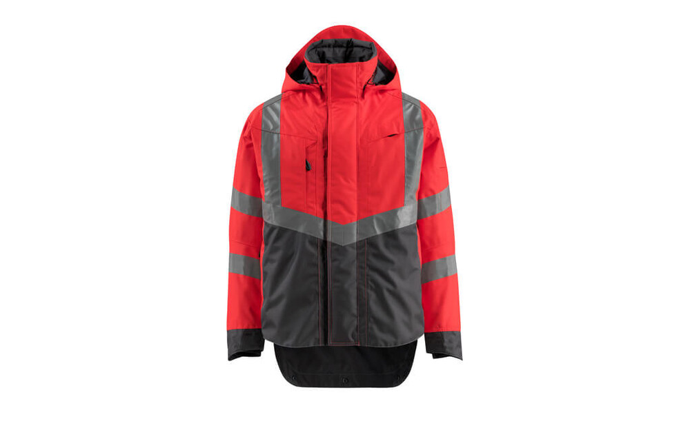 Fluoreszierend und mit Reflexschulterstreifen sowie schrägverlaufenden Reflexen. Zweifarbig. Atmungsaktiv, wind- und wasserdicht. Nähte sind verklebt. Futter aus Netzmaterial. Kapuze, abnehmbar, gefüttert und mit Elastikschnüren regulierbar, so dass diese über einen Helm passt. Regulierbarer Draht an beiden Seiten der Kapuze. Netzventilation mit Reißverschluss unter den Ärmeln. Stehkragen. Innenkragen aus Strick. Wasserdichte Stifttasche am Ärmel. Verschluss mit Reißverschluss und Wetterschutzleiste mit Druckknöpfen. Reißverschlussinnentaschen unter der Wetterschutzleiste – die eine speziell für Handys entwickelt, mit Öffnung sowie Schlaufen für das Kopfhörerkabel. Tasche mit Reißverschluss unter der Wetterschutzleiste, mit Platz für ein 7 Zoll Tablet. Verlängerter Rücken durch herunter knöpfbaren Stoff zum besseren Schutz vor Wind und Wetter. Brusttasche mit Reißverschluss. D-Ring. Ergonomisch geschnittene Ärmel ermöglichen hohe Bewegungsfreiheit. Rippenbündchen an den Handgelenken schließen gut ab und halten die Kälte draußen. Manschettenmit Verstärkungen aus CORDURA®-Gewebe und Druckknopfverschluss. Vordertaschen mit Reißverschluss. Hi-Vis Gruppe A. Zertifiziert nach EN ISO 20471 - Kl. 3 und EN 343 - Kl. 3/3. Das Produkt ist zertifiziert, dass dieses mit einem Logo von 0,0400 m² versehen werdendarf. Dieses zulässige Areal darf nicht überschritten werden. Das Logo auf der Vorder- und Rückseite darf jeweils maximal 50% des gesamten Logoareals betragen, um die Zertifizierung gemäß EN ISO 20471 beizubehalten.