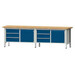 -Kastenwerkbank Serie V, Breite 2800 mm Die Werkbänke der Serie V verfügen über massive Buchenplatten. Die Werkbankplatten sind längsseitig riegelartig zahnverleimt, die Oberflächen sind geölt. Die Gesamttraglast der Werkbänke beträgt 1500 kg.