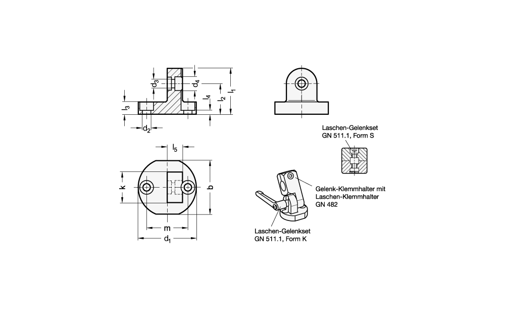 Fußlaschen-Klemmhalter GN 485 lassen sich mit Laschen-Klemmhalter GN 482, T-Laschen-Klemmhalter GN 483 sowie mit Anbau-Laschen-Klemmhalter GN 484 mit gleichen k-Maßen zu Gelenk-Klemmhaltern kombinieren. Dazu stehen Laschengelenksets GN 511.1 mit Schraube (Form S) und mit verstellbarem Klemmhebel (Form K) zur Verfügung. Die Bestellbezeichnung ist jeweils der Maßtabelle zu entnehmen.