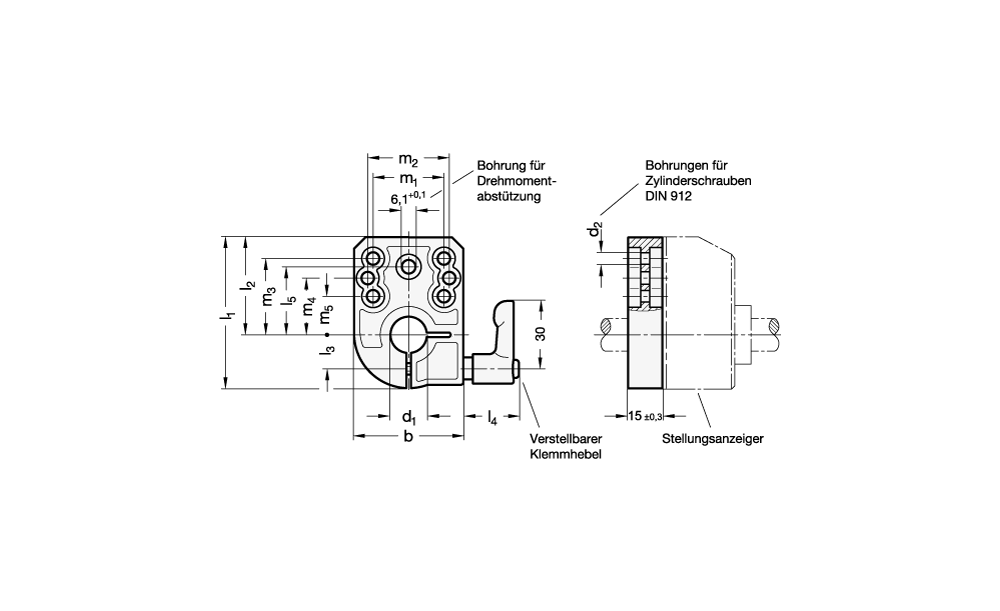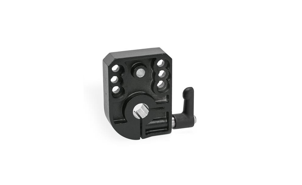 Klemmplatten GN 953.7 werden in Verbindung mit Stellungsanzeigern GN 953 und GN 953.2 eingesetzt. Über die Befestigungsbohrungen können marktübliche Bohrbilder abgedeckt werden. Auf einfache Weise und ohne großen Konstruktions- und Montageaufwand können Spindeln nach dem Verstellen geklemmt und damit gesichert werden. Gleichzeitig sind die Platten mit der Bohrung Ø 6,1 zur Aufnahme der Drehmomentabstützung des Stellungsanzeigers versehen. Die Klemmplatte kann so montiert werden, dass die Lage des Klemmhebels wahlweise links oder rechts ist.