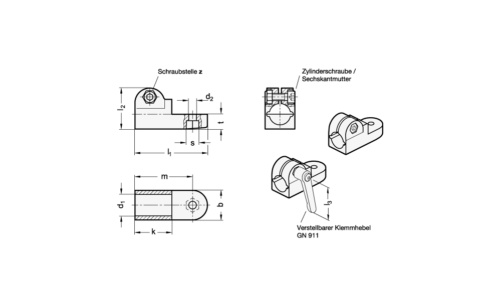 An der Schraubstelle z verkleinert die Zylinderschraube den Bohrungsquerschnitt zum Klemmen. Wenn werkzeuglos geklemmt werden soll, kann die Zylinderschraube, durch einen in der Tabelle als Zubehör angegebenen verstellbaren Klemmhebel GN 911 ersetzt werden.