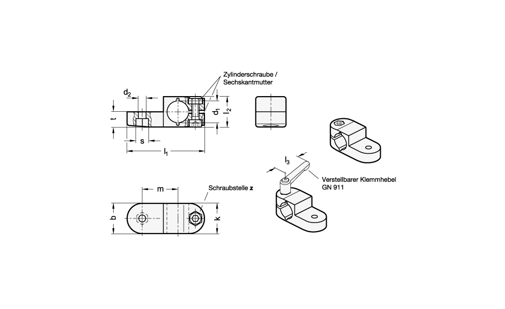 An der Schraubstelle z verkleinert die Zylinderschraube den Bohrungsquerschnitt zum Klemmen. Wenn werkzeuglos geklemmt werden soll, kann die Zylinderschraube, durch einen in der Tabelle als Zubehör angegebenen verstellbaren Klemmhebel GN 911 ersetzt werden.