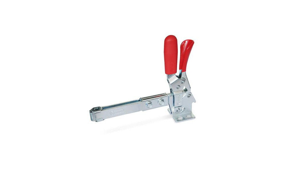 Schnellspanner, Stahl, Spannhebel vertikal, mit Verriegelung, mit waagrechtem Fuß, mit verlängertem Spannarm