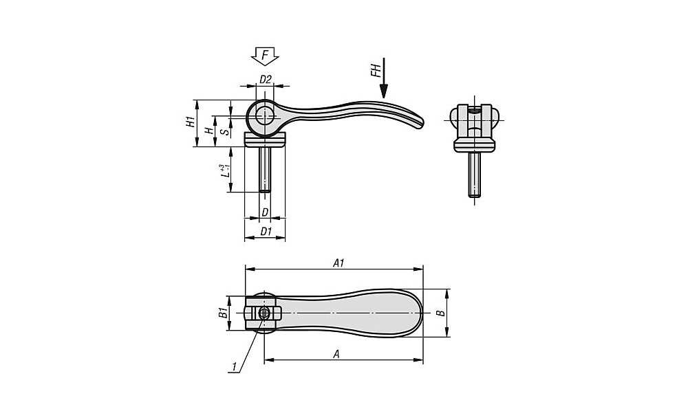 Werkstoff: Griffhebel aus Aluminiumguss EN AC-46200. Druckscheibe aus Kunststoff PA 66 GF 35-X glasfaserverstärkt. Achsbolzen Edelstahl 1.4305. Stiftschraube und Scheibe Stahl Festigkeitsklasse 5.8 oder Edelstahl 1.4305. Ausführung: Griffhebel pulverbeschichtet schwarz Feinstruktur oder rot RAL 3003 Feinstruktur. Druckscheibe schwarz. Achsbolzen blank. Stiftschraube und Scheibe Stahl blau passiviert oder Edelstahl blank. Bestellbeispiel: K0006.9501103X10 (Länge L mit angeben) Hinweis: Exzenterhebel einstellbar werden eingesetzt, wenn die Lage des Spannhebels zur Spannachse nur eine bestimmte Stellung erlaubt (Störkreis). Über das an der Stiftschraube befindliche Feingewinde wird die genaue Stellung des Spannhebels mit Hilfe eines Schraubendrehers eingestellt. Kunststoffe haben die Eigenschaft, dass sie unter Last kriechen (Retardation). Zeichnungshinweis: 1) Stift zur Feinjustage des Spannhebels