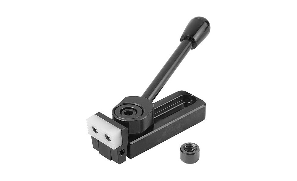 Der Niederzugspanner ist ein Schnellspannelement, mit dem Werkstücke durch den Schwenkbacken über den Spiralexzenter gleichzeitig an die Festanschläge und auf eine Auflage gedrückt werden.
