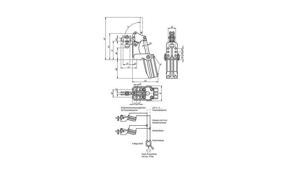 Zur Auswahl der richtigen Spannergröße ist bei den Pneumatikspannern neben der Haltekraft auch die mögliche Spannkraft bei 6 bar Luftdruck (zulässig sind beliebige Druckmedien, Höchstdruck 10 bar) angegeben. F3 ist die mögliche Spannkraft, die der Spanner am Spannarmende, F4 die Kraft, die er auf der Drehpunktseite ausübt.