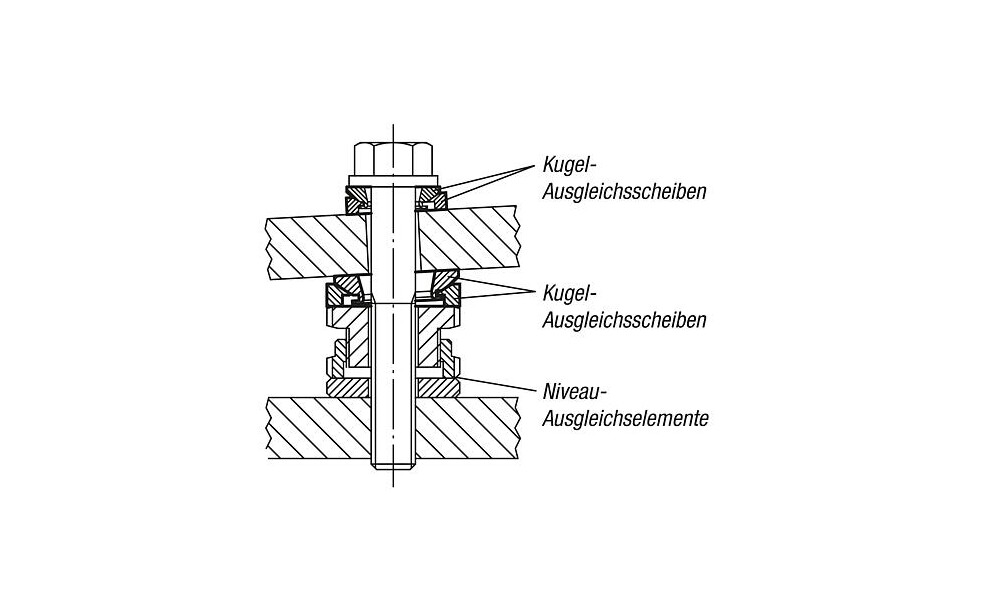 Die Kugel-Ausgleichsscheibe ermöglicht eine exakte Anlage bei der Montage von schrägen Auflageflächen bis zu einem Neigungswinkel von ca. 4°. Bei Schräglagen von D3 > 1° ist zur gleichmäßigen Auflage der Schrauben eine weitere Kugel-Ausgleichsscheibe als Unterlage zu empfehlen. Ober- und Unterteil können nicht auseinanderfallen, sie sind gesichert.