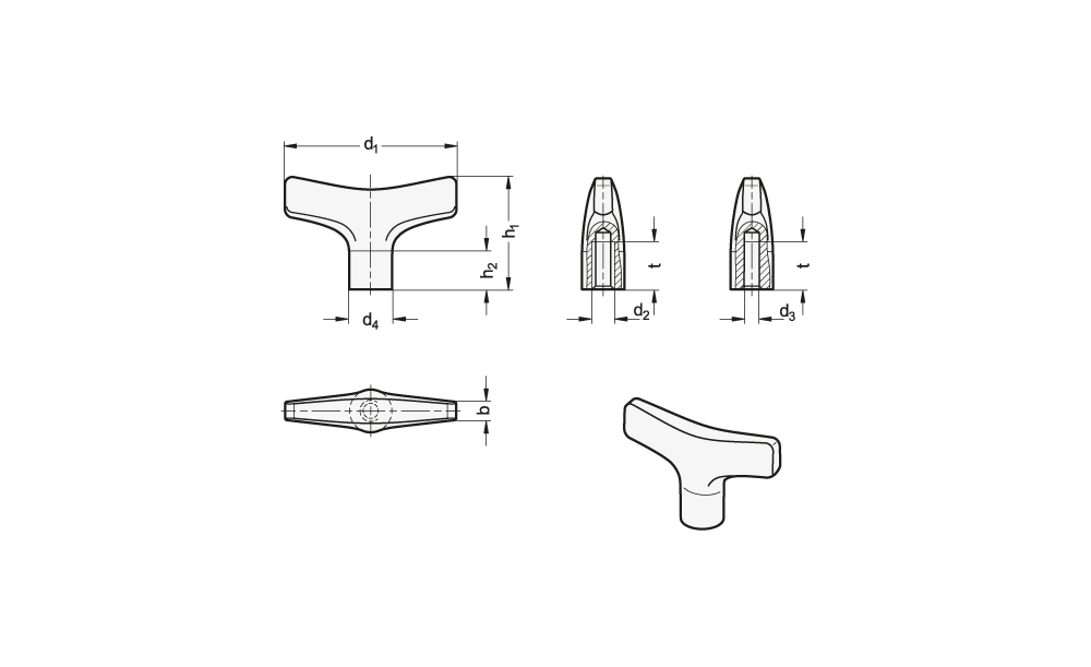 Mit T-Griffen GN 5063 lassen sich Bauteile heben, bewegen und schalten oder mittels Gewinde spannen. Durch die ergonomische Griffform können dabei große Bedienkräfte erzielt werden.