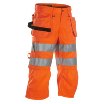 Zwei mit Cordura verstärkte, lose Nageltaschen, die in den Vordertaschen mit Balgfunktion verstaut werden können. Zwei CORDURA®-verstärkte Balggesäßtaschen. Hammerschlaufe. Kräftiger Metallreißverschluss. Verstärkte Zollstocktasche mit Stiftfach und Messerhalter. Rechte Nageltasche mit Schraubenzieherfach. Knieschutztaschen. Handytasche. 3/4-lange Beine. D-Ring an der vorderen Schlaufe. Fluoreszierende Farbe. 65 mm breite Reflektoren. Zertifiziert nach EU-Norm EN 471 Klasse 2, Warnschutzkleidung mit hoher Sichtbarkeit. Ausweistasche.