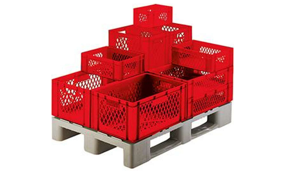 -Transport-Stapelkasten, Wände und Boden durchbrochen, rot Für den Einsatz auf Rollenbahnen sind diese Stapelkästen geeignet.