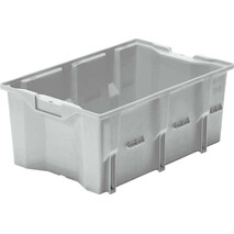 -Drehstapelbehälter Serie DLK, grau Diese Drehstapelbehälter sind aufeinander und nach 180°-Drehung ineinander stapelbar.