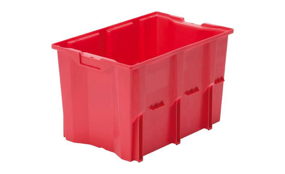 -Drehstapelbehälter Serie DLK, rot Diese Drehstapelbehälter sind aufeinander und nach 180°-Drehung ineinander stapelbar.