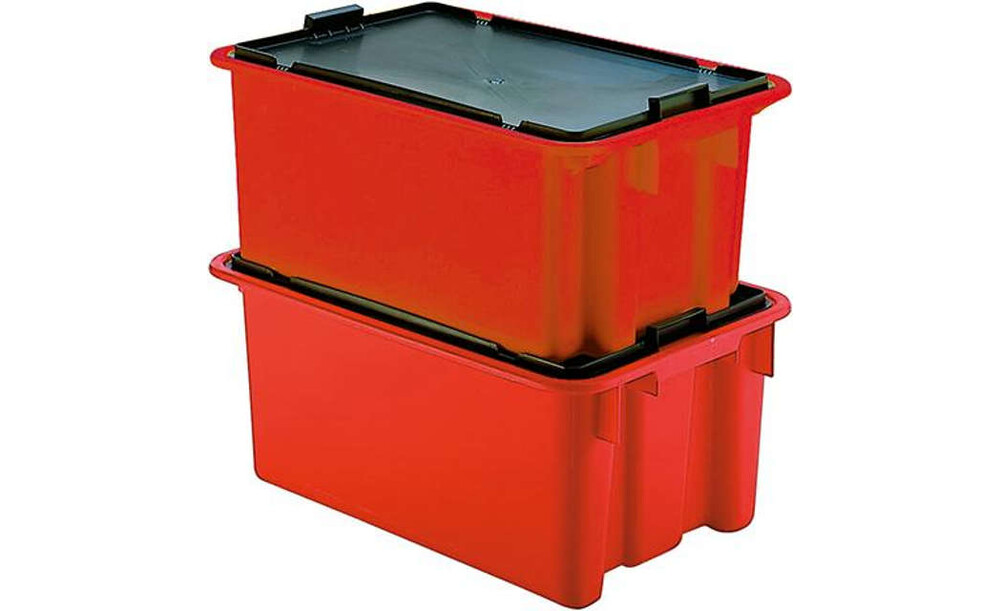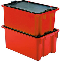 -Drehstapelbehälter, rot Diese Drehstapelbehälter sind aufeinander und nach 180°-Drehung ineinander stapelbar.