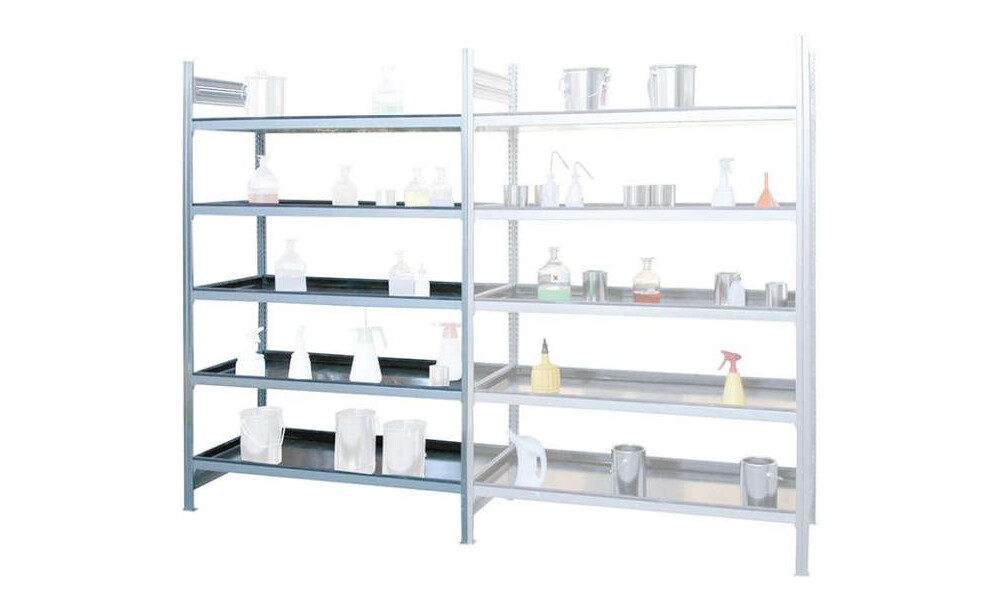 -Kleingebinde-Gefahrstoffregal mit 5 Wannenböden (PE) Diese Kleingebinde-Gefahrstoffregale sind beidseitig nutzbar. Geeignet sind sie zur vorschriftsmäßigen Lagerung von wassergefährdenden Flüssigkeiten, Säuren und Laugen.