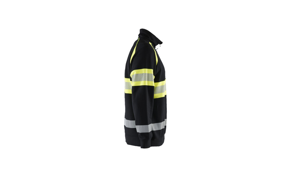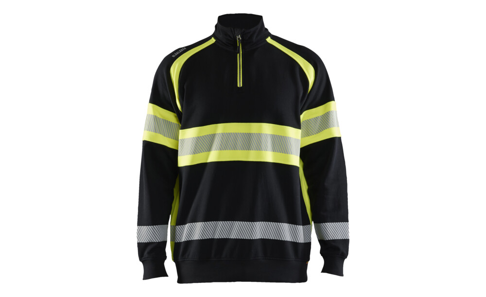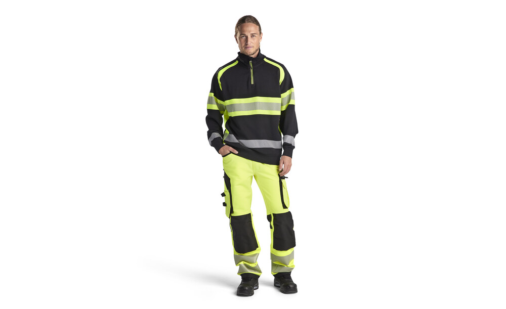 Ein weicher und bequemer High Vis Sweater mit unterbrochenen Reflexstreifen für besonders gute Stretch-Fähigkeit und Atmungsaktivität. Er hat einen hohen Kragen, einen Half Zip-Reißverschluss und Bündchen an der Unterseite und den Ärmelenden für höheren Komfort. Der dunkle Teil des Sweaters besteht aus 100 Prozent Baumwolle und der High Vis-Teil ist aus 100 Prozent Polyester gefertigt. Zertifiziert nach EN ISO 20471, Klasse 1.