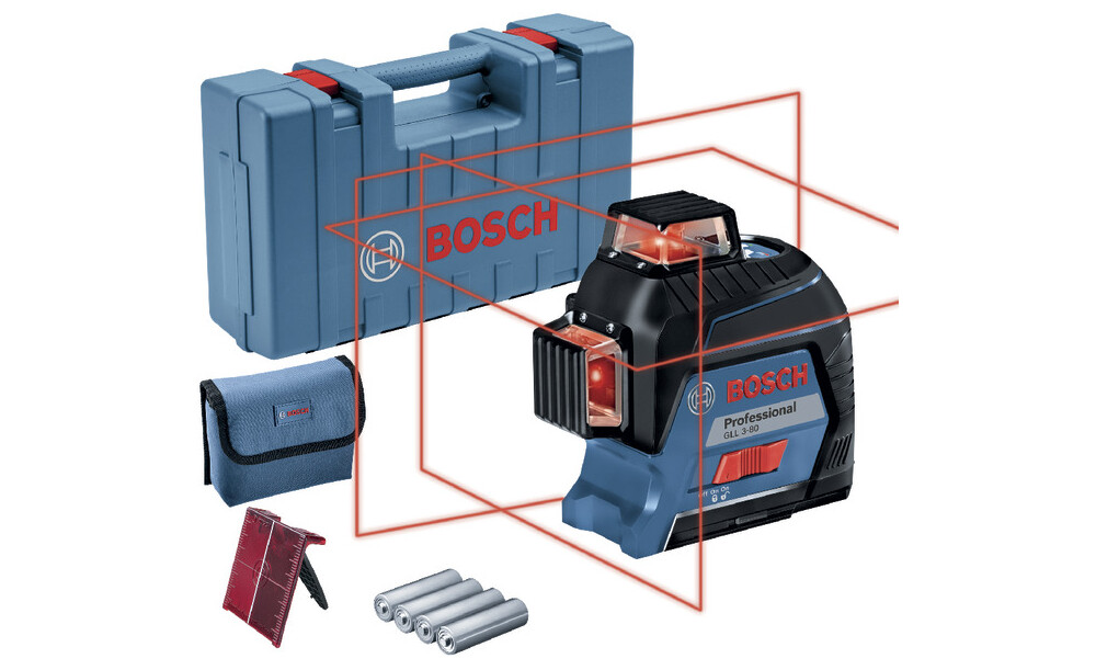 - Ausführungstarke Sichtbarkeit dank Hochleistungsdioden, 3× 360°-Linien zum gleichzeitigen Durchführen horizontaler und vertikaler Nivellierarbeiten