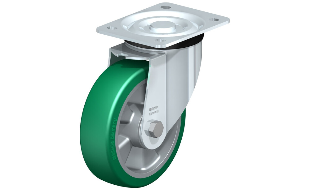 - Laufbelag: hochwertiges Polyurethan-Elastomer Blickle Softhane®, Härte 75 Shore A, Farbe grün, spurlos, kontaktverfärbungsfrei