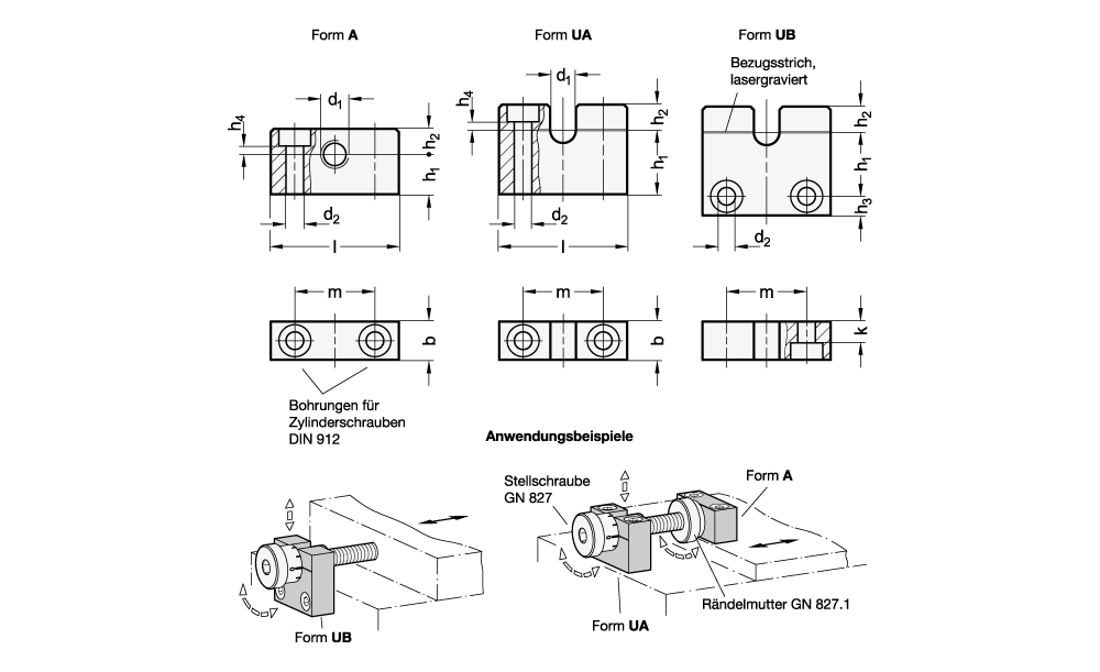 An Bearbeitungs- und Montageeinrichtungen, an denen Aufnahmen und Vorrichtungen wiederkehrend gewechselt werden müssen, erlaubt die Kombination von Stellschrauben GN 827, Rändelmuttern GN 827.1 und Lagerböcken GN 828 der Formen UA und UB besonders einfache Wechselvorgänge, ohne dabei einmal festgelegte Einstellungen zu verlieren.