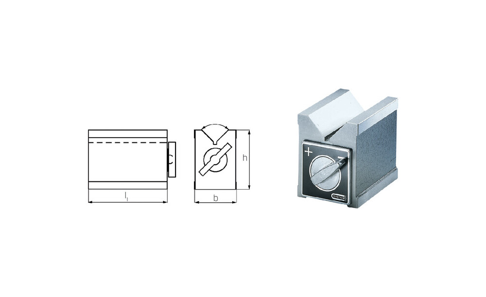 Vier magnetische Kontaktflächen (Ober- und Unterseite sowie zwei Stirnflächen). Beim Einschalten werden prismatische und gegenüberliegende Flächen magnetisiert. Die Magnet-Prismen sind vollkommen abgedichtet. Genauigkeit: Planparallelität unter 0,01 mm.
