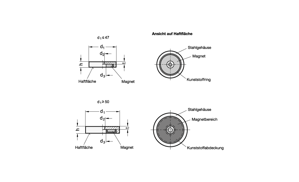 Ab dem Durchmesser d1 = 50 ist die Haftfläche des Magneten mit der vollflächigen Kunststoffabdeckung versehen.