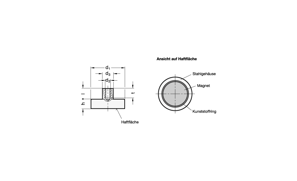 Haltemagnete GN 50.2 bilden in Kombination mit dem Stahlgehäuse und dem Kunststoffring ein System, welches den Magnet schirmt, verstärkt und den magnetischen Fluss optimal auf die Haftfläche umleitet.