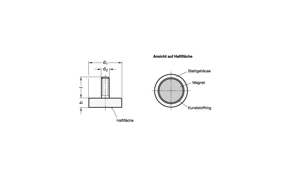 Haltemagnete GN 50.3 bilden in Kombination mit dem Stahlgehäuse und dem Kunststoffring ein System, welches den Magnet schirmt, verstärkt und den magnetischen Fluss optimal auf die Haftfläche umleitet.