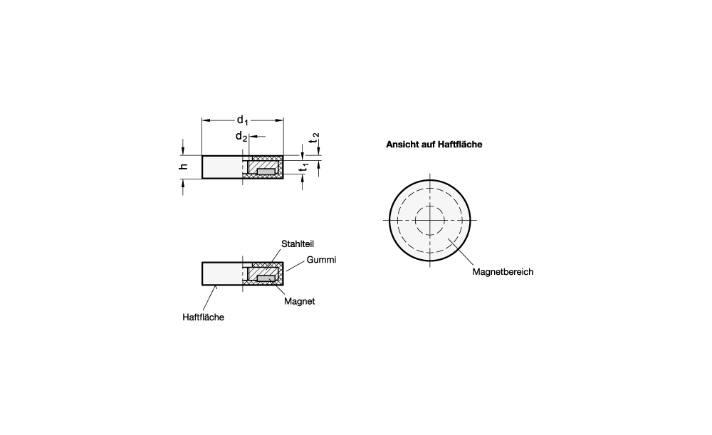 Haltemagnete GN 51.5 mit Gummiummantelung bilden im Verbund mit dem Stahlteil ein System, welches den Magnet schirmt, verstärkt und den magnetischen Fluss optimal auf die gummierte Haftfläche konzentriert.