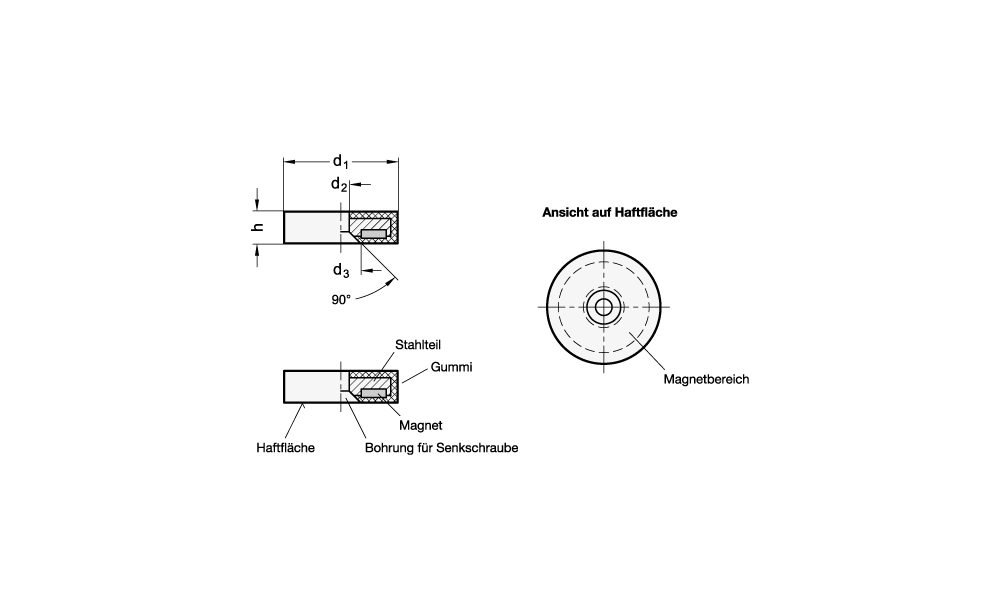 Haltemagnete GN 51.8 mit Gummiummantelung bilden im Verbund mit dem Stahlteil ein System, welches den Magnet schirmt, verstärkt und den magnetischen Fluss optimal auf die gummierte Haftfläche konzentriert. Der Gummi schützt empfindliche Oberflächen vor Beschädigungen durch den Magnet und verfügt zudem über einen großen Reibungskoeffizienten, wodurch sich hohe seitliche Verschiebekräfte ergeben.