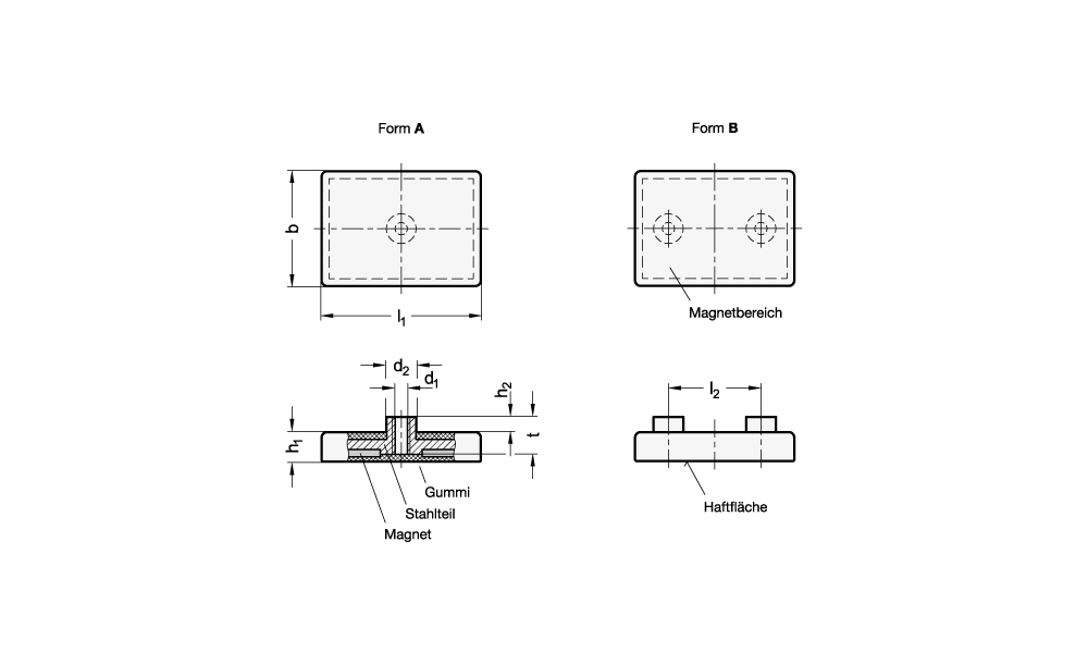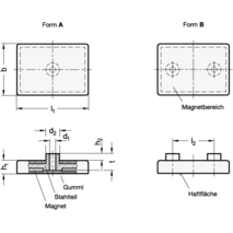 Haltemagnete GN 57.1 mit Gummiummantelung bilden im Verbund mit dem Stahlteil ein System, welches den Magnet schirmt, verstärkt und den magnetischen Fluss optimal auf die gummierte Haftfläche konzentriert.