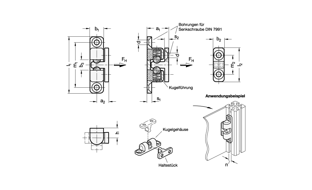 Über die konventionellen Einsatzbereiche hinaus finden die solide und formschön gestalteten Kugelschnäpper auch im technischen Umfeld ihre Anwendung. Bei Verwendung an Profilsystemen darf die in der Tabelle angegebene Nutbreite n nicht überschritten werden.