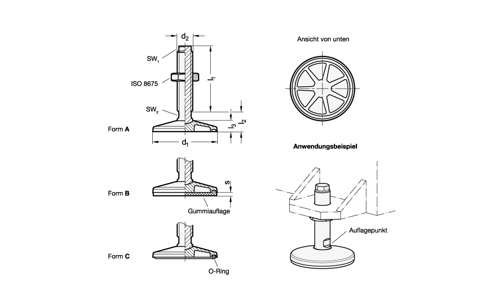 Die Form B mit Gummiauflage verhindert seitliches Verrutschen, schützt empfindliche Oberflächen und dämpft Vibrationen und Erschütterungen. Bei der Form C mit O-Ring wird eine Abdichtung gegenüber dem Boden erreicht, sodass Verschmutzungen unter dem Fuß verhindert werden.