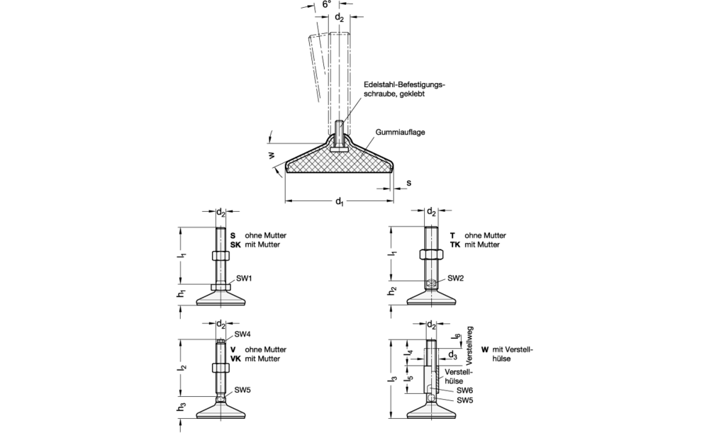 Stellfüße, Edelstahl 1.4301 (A2), FDA-konform