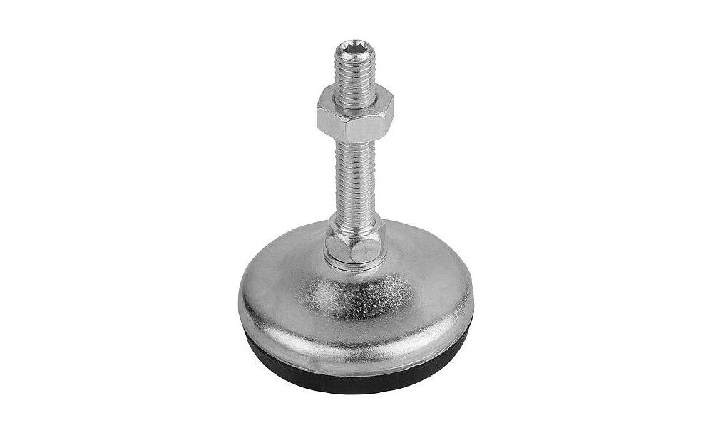 Stellfüße aus Stahl oder Edelstahl mit drehbar gelagerter Gewindespindel und Gummi-Aufstellfläche. Die massive Gummiauflage ist durch Aufvulkanisieren fest mit dem Blechteller verbunden. Die Gummiauflage hat eine ausgezeichnete Bodenhaftung. Sie wirkt körperschalldämmend und erschwert die Übertragung von Schwingungen und Stößen auf den Boden.