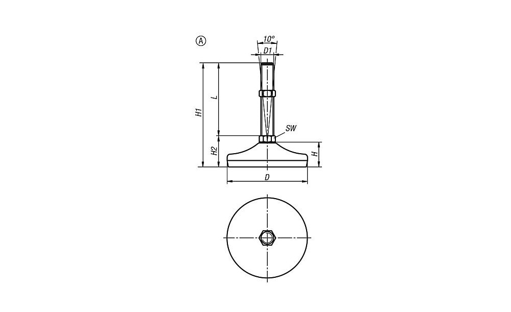 STELLFUß, FORM:A M12X150, D=50, EDELSTAHL 1.4301, KOMP:GUMMI