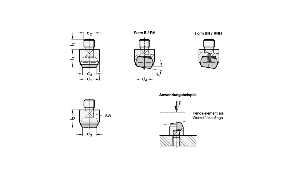 Pendelelemente GN 709.15 werden als bewegliche Auflagen oder Druckstücke zum Spannen von Werkstücken verwendet. Sie können auch als Anschlag eingesetzt werden. Bei Gussteilen empfiehlt es sich Pendelelemente mit einer Hartmetallkugel zu verwenden.