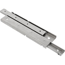 Vollauszug bestehend aus zwei Führungsschienen als festes und bewegliches Element und einem S-förmigen Zwischenelement. Dieses hat ein hohes Flächenträgheitsmoment und eine hohe Steifigkeit bei schlanker Bauweise. Hieraus resultiert eine hohe Belastbarkeit mit geringer Durchbiegung im ausgefahrenen Zustand. Der maximale Hub ist größer als die geschlossene Länge der Teleskopschiene.