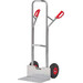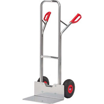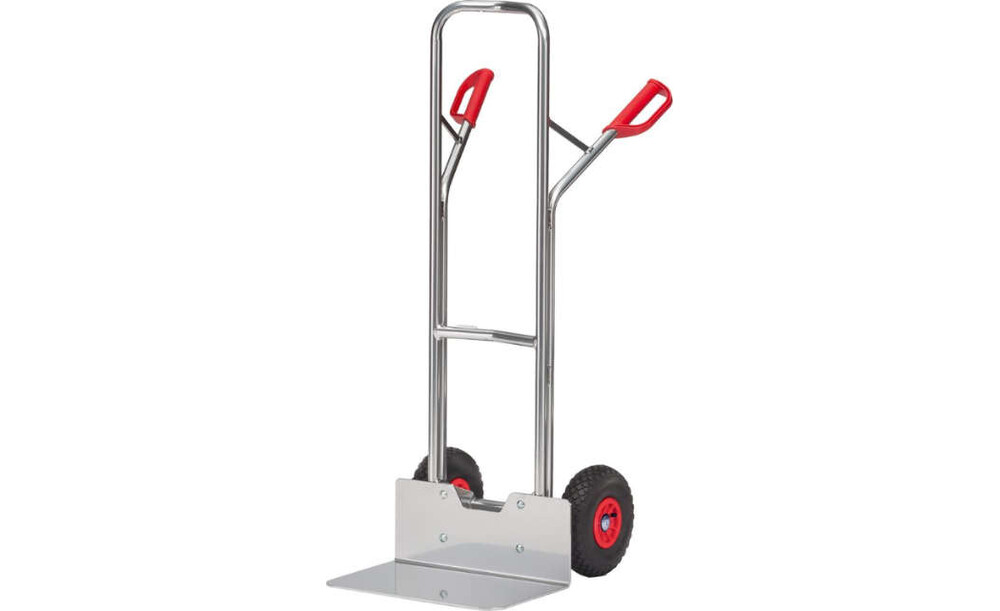 -Aluminium-Transportkarre mit Luftbereifung Die Sack- und Stapelkarren verfügen über einen gebogenen Anlagebügel zum sicheren Transportieren von runden Gütern wie Rollen, Kannen, Eimern etc. Die Karre lässt sich bei Beladung mit hohen, kastenförmigen Gütern komfortabel in Fahrstellung kippen, da wegen des durchgebogenen oberen Anlagebügels Platz zum Eingreifen zwischen Bügel und Transportgut bleibt.