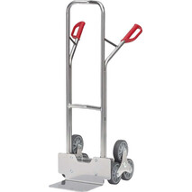 -Aluminium-Treppenkarren Durch die gebogenen Anlagebügel lassen sich runde Güter wie Rollen, Kannen, Eimer etc. mit den Treppenkarren sicher transportieren. Hohe, kastenförmige Güter lassen sich komfortabel in Fahrstellung kippen, da wegen des durchgebogenen oberen Anlagebügels Platz zum Eingreifen zwischen Bügel und Transportgut bleibt.