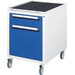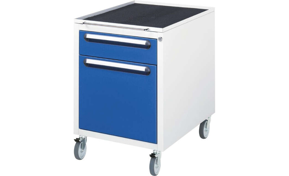 - Rollcontainer: zusätzlich mit 4 Lenkrollen (Rollen-Ø 100 mm), davon 2 mit Feststeller sowie Deckel mit Bügelgriff, Abrollband und Antirutschmatte