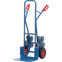 -Stahlrohr-Treppenkarren Durch die gebogenen Anlagebügel lassen sich runde Güter wie Rollen, Kannen, Eimer etc. mit den Treppenkarren sicher transportieren. Hohe, kastenförmige Güter lassen sich komfortabel in Fahrstellung kippen, da wegen des durchgebogenen oberen Anlagebügels Platz zum Eingreifen zwischen Bügel und Transportgut bleibt.