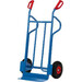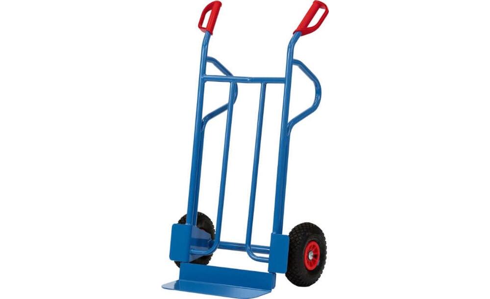 -Stahlrohrkarre (Sack- und Stapelkarre) mit Luftbereifung Robuste Sack- und Stapelkarren mit gebogenen Anlagebügel zum sicheren Transportieren von runden Güter wie Rollen, Kannen, Eimer usw.. Die Karre lässt sich bei Beladung mit hohen, kastenförmigen Gütern komfortabel in Fahrstellung kippen, da wegen des durchgebogenen oberen Anlagebügels Platz zum Eingreifen zwischen Bügel und Transportgut bleibt.