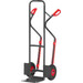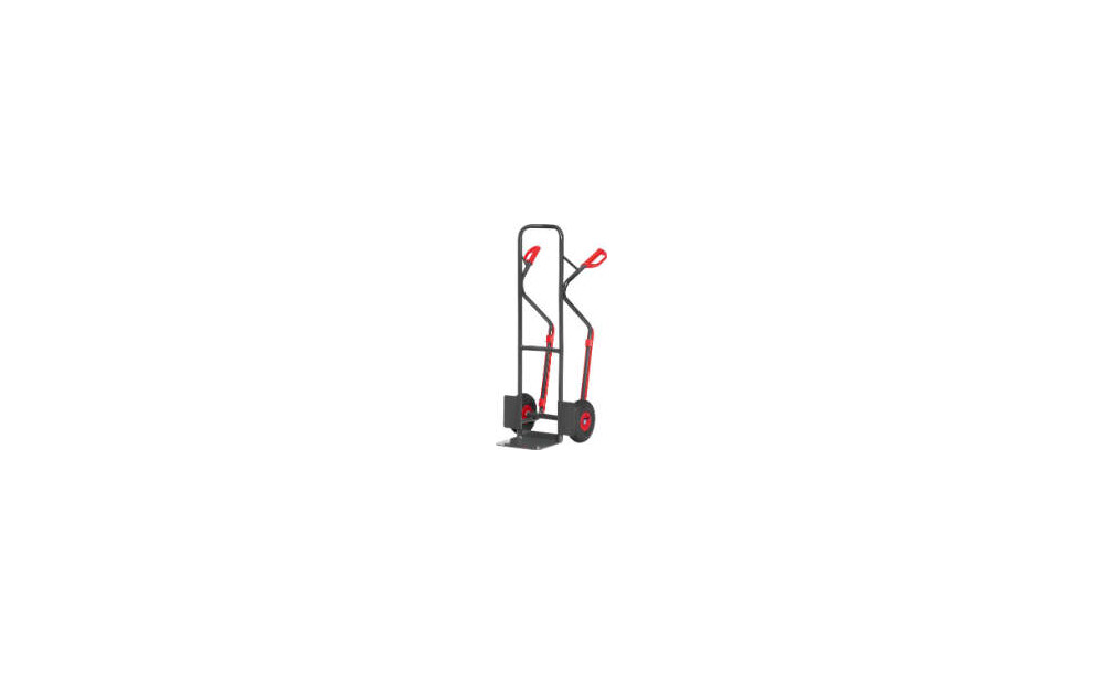 -Stahlrohrkarre (Sack- und Stapelkarre) mit Luftbereifung Robuste Sack- und Stapelkarren mit gebogenen Anlagebügel zum sicheren Transportieren von runden Güter wie Rollen, Kannen, Eimer usw.. Die Karre lässt sich bei Beladung mit hohen, kastenförmigen Gütern komfortabel in Fahrstellung kippen, da wegen des durchgebogenen oberen Anlagebügels Platz zum Eingreifen zwischen Bügel und Transportgut bleibt.