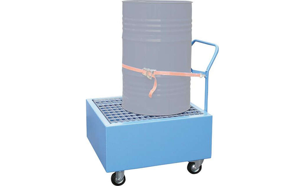 -Fasswagen Stahl, Typ WSP Die stabilen Fasswagen mit Auffangwanne sind zum Lagern und Transportieren von wassergefährdenden und entzündbaren Flüssigkeiten geeignet. Sie sind mit Schubstange sowie 2 Lenk- und 2 Bockrollen ausgestattet.
