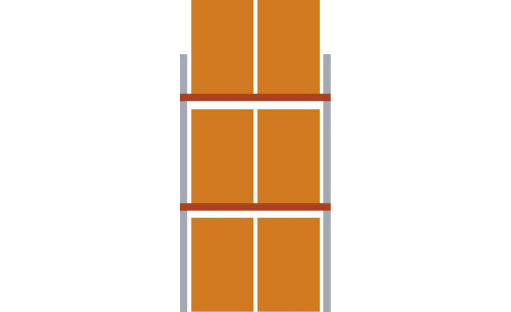 -Komplettregal mit 3 Lagerebenen Diese Palettenregale eignen sich für leichte bis mittelschwere Belastung. Die geschlossenen Kastenprofile garantieren eine hohe Stabilität und die Ständer bestehen aus kaltverformten Profilen, die bauseits mit der Ausfachung verschraubt werden. Eine Längs- oder Quereinlagerung ist möglich.