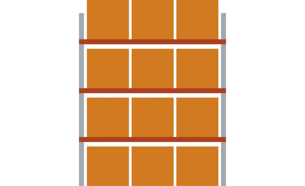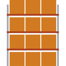 -Komplettregal mit 4 Lagerebenen Diese Palettenregale eignen sich für leichte bis mittelschwere Belastung. Die geschlossenen Kastenprofile garantieren eine hohe Stabilität und die Ständer bestehen aus kaltverformten Profilen, die bauseits mit der Ausfachung verschraubt werden. Eine Längs- oder Quereinlagerung ist möglich.