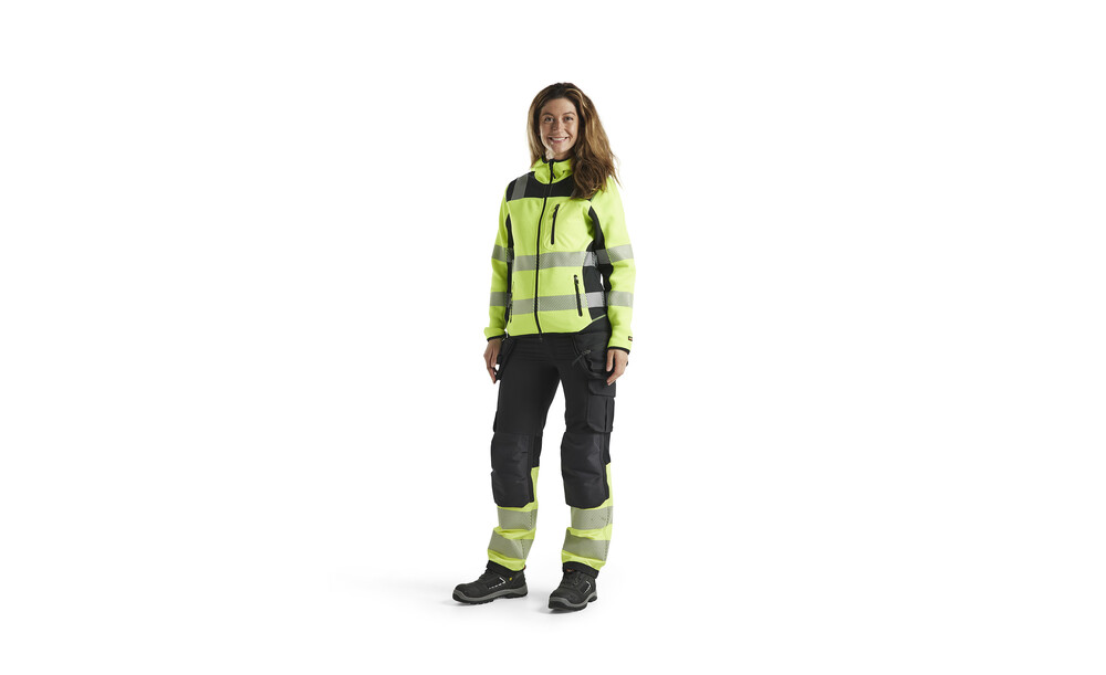 Stylische High Vis Jacke aus einem bequemen Strickgewebe, entworfen für die weibliche Figur. Unterbrochene Reflexstreifen sorgen für mehr Atmungsaktivität und Mobilität. Die Jacke hat Reißverschlüsse und ist mit Softshell Stoff an den Schultern, Ärmeln und am Hintersaum verstärkt, wodurch sich die Haltbarkeit erhöht. Dies ist eine tolle Jacke für Freizeit und Beruf. Zertifiziert nach der Norm EN ISO 20471, Klasse 2.