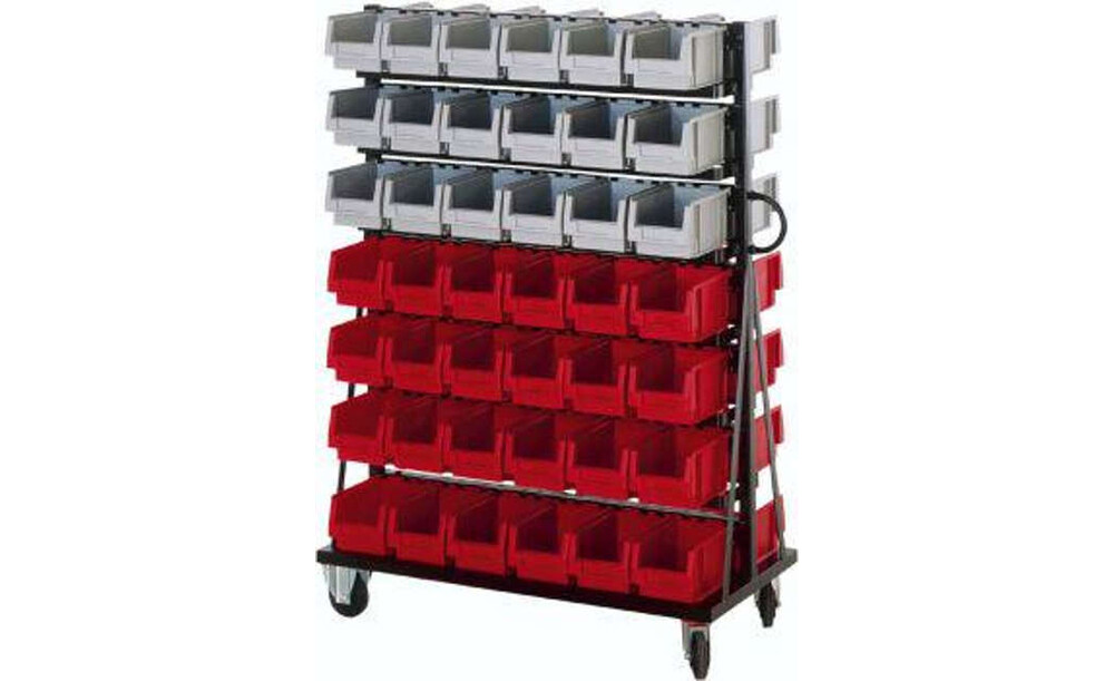 -Montage-Rollwagen Dieser Rollwagen ist ein mobiles, kippsicheres Kleinteilelager für Produktions- und Montagearbeitsplätze. Er ist beidseitig nutzbar.
