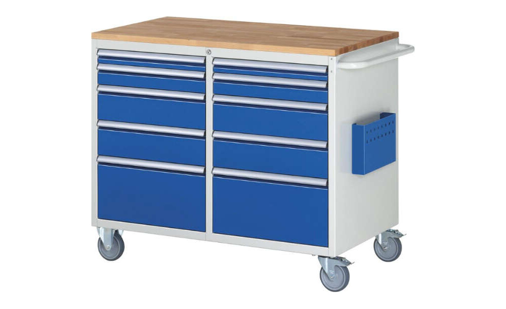 -Montagewagen Serie 7000 Diese Montagewagen verfügen über eine Buche-Massiv-Arbeitsplatte, Stärke 25 mm, mit geölter Oberfläche.