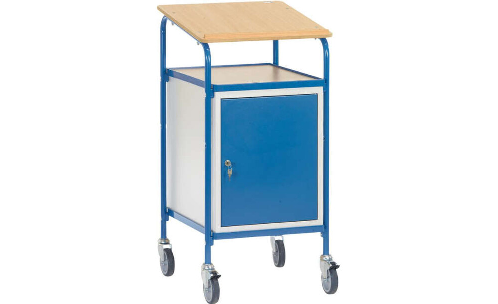 -Rollpult mit Stahlschrank Diese Rollpulte sind dank 4 großer Lenkrollen sehr gut zu dirigieren. Auch über Kanten und Schwellen lassen sich die Rollpulte sehr leicht fahren.