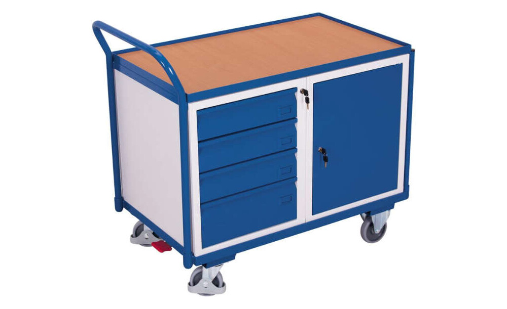 Tischwagen VARIOfit, 250kg B1125xT625xH1010mm RAL 7035/5010 4 Schubladen, 1 Schrank